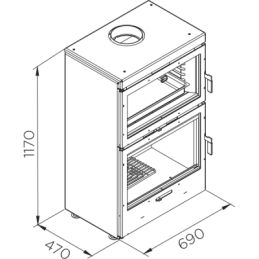 Poele-Four version d’angle. Caractéristiques Four: Capacité de 55 litres, base et fond de réfractaire et côté en acier inoxydable. Avec thermomètre et un plateau. Caractéristiques Poêle: Intérieur en verméculite avec registre d’air primaire et secondaire. Comprend grill et tiroir à cendres.